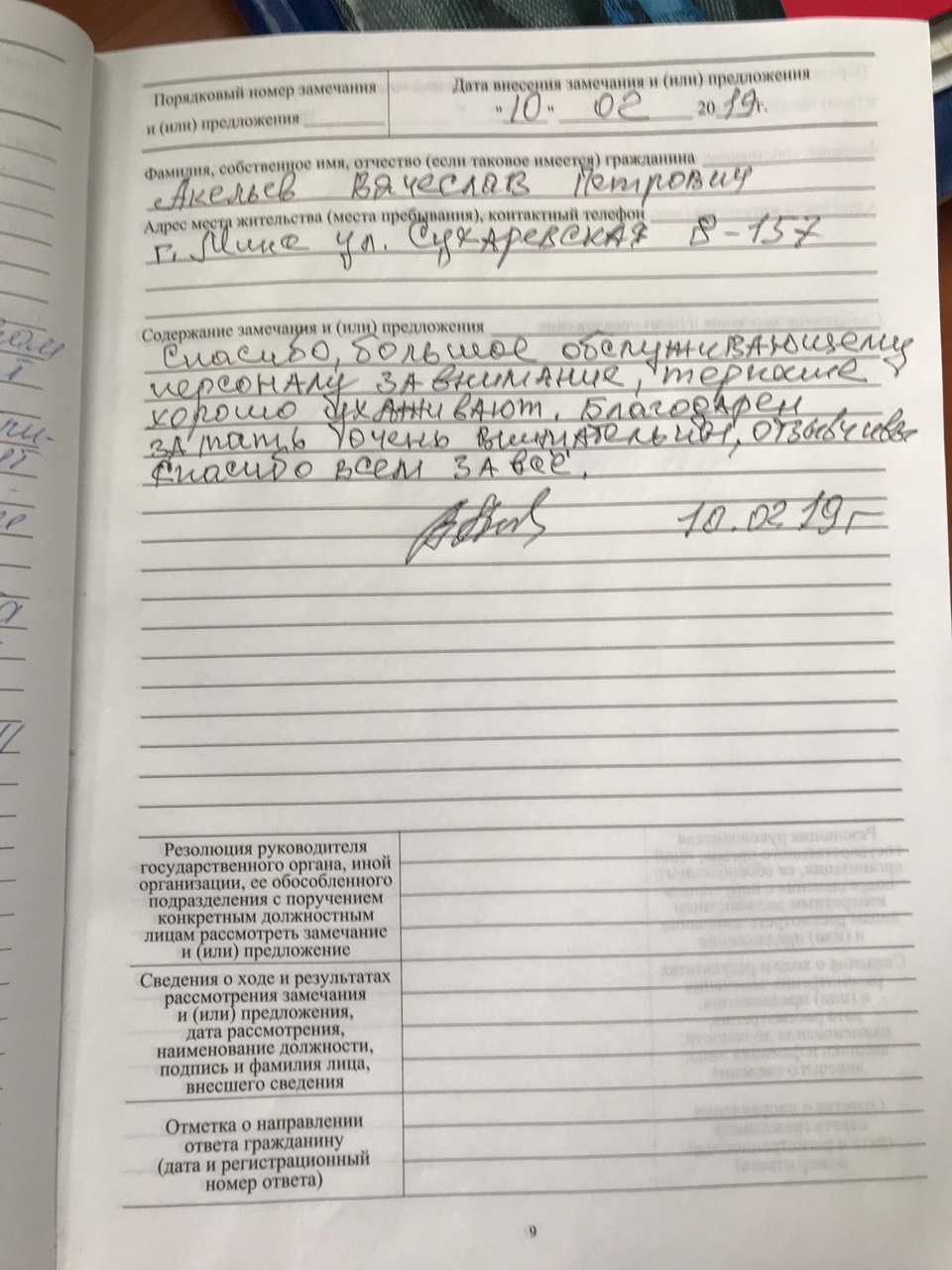 Спасибо большое обслуживаещему персоналу за внимание, терпение, хорошо ухаживают. Благодарен за мать, очень внимательные отзывчивые. Спасибо всем за всё.